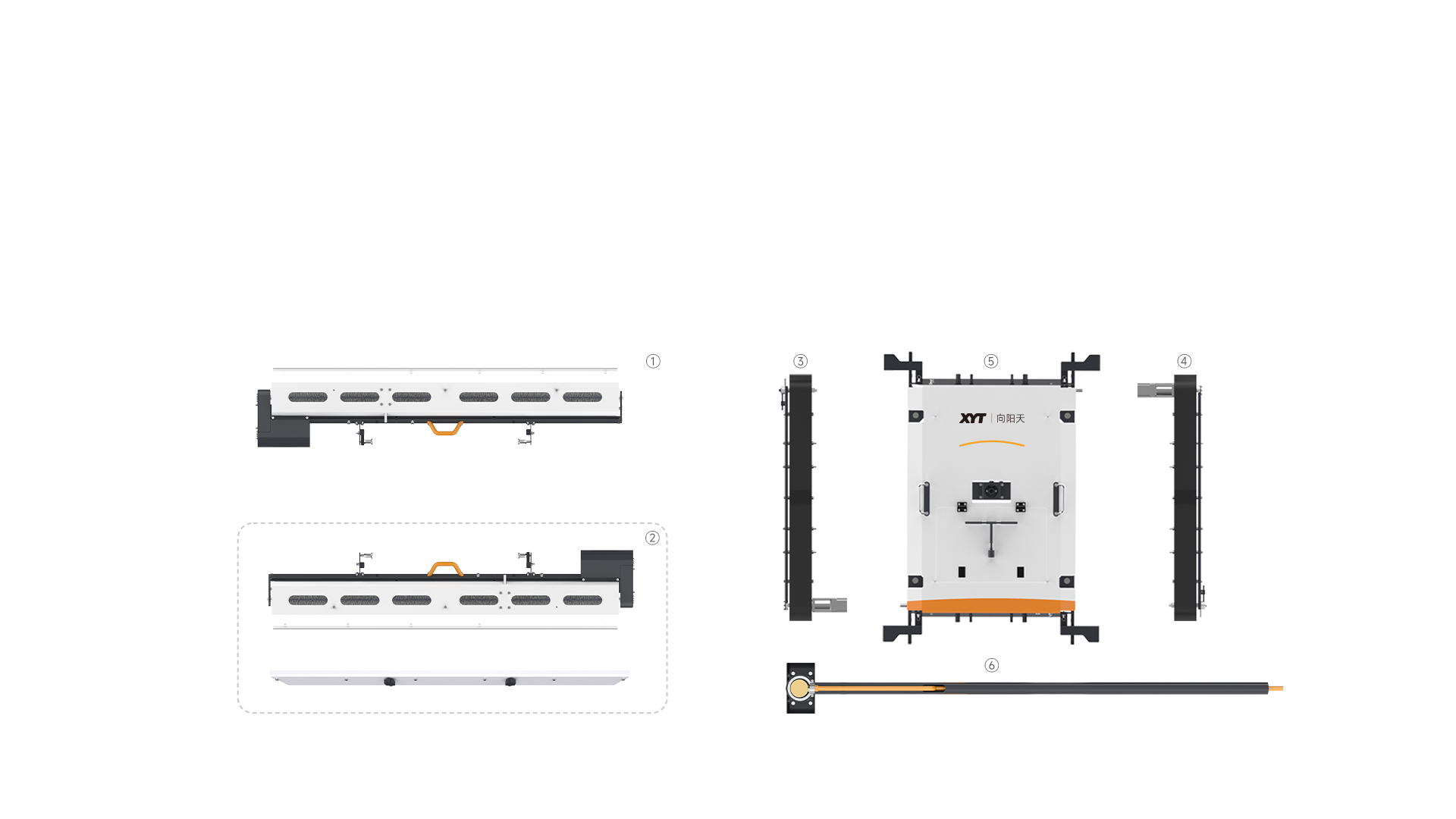 ① Cabeça da escova frontal ② Opcional: Cabeça de escova traseira/conjunto de raspador com spray (unidade integrada) – escolha uma opção ③ Pista (esquerda) ④ Pista (direita) ⑤ Carroceria do veículo ⑥ Braço oscilante acionado por água
